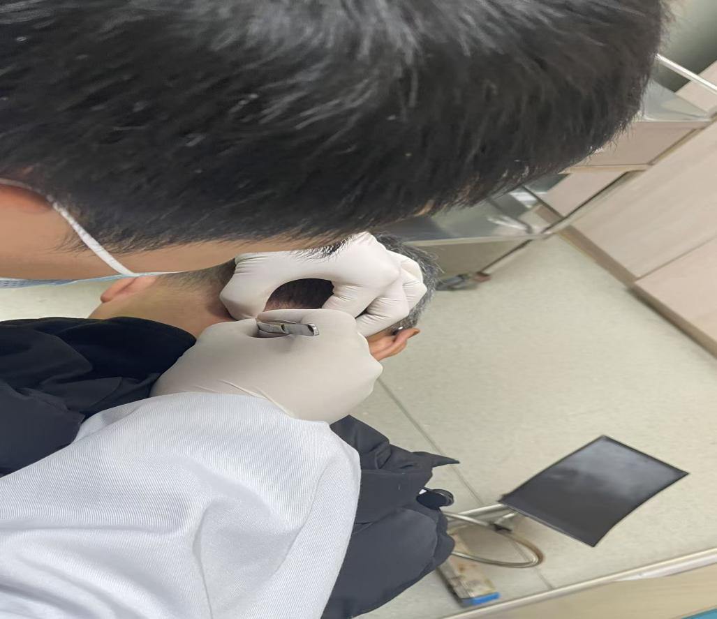 接诊的朱成武医生仔细检查后发现,沈大爷后颈中央的皮肤红肿明显,中央还有一个凹陷的小点,仔细一看,蜜蜂的毒刺竟然还残留在皮肤里!最终,沈大爷被诊断为蜂蜇伤合并过敏性皮疹。